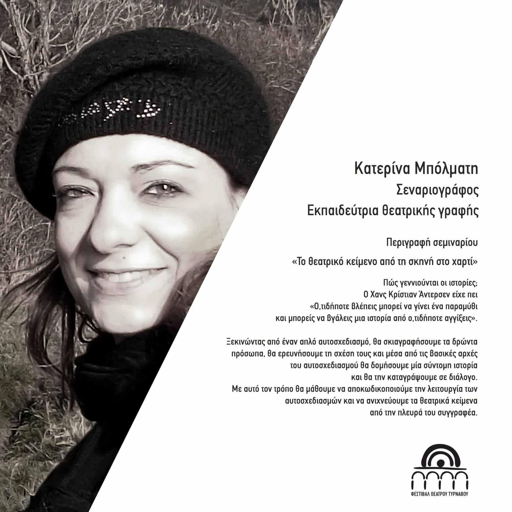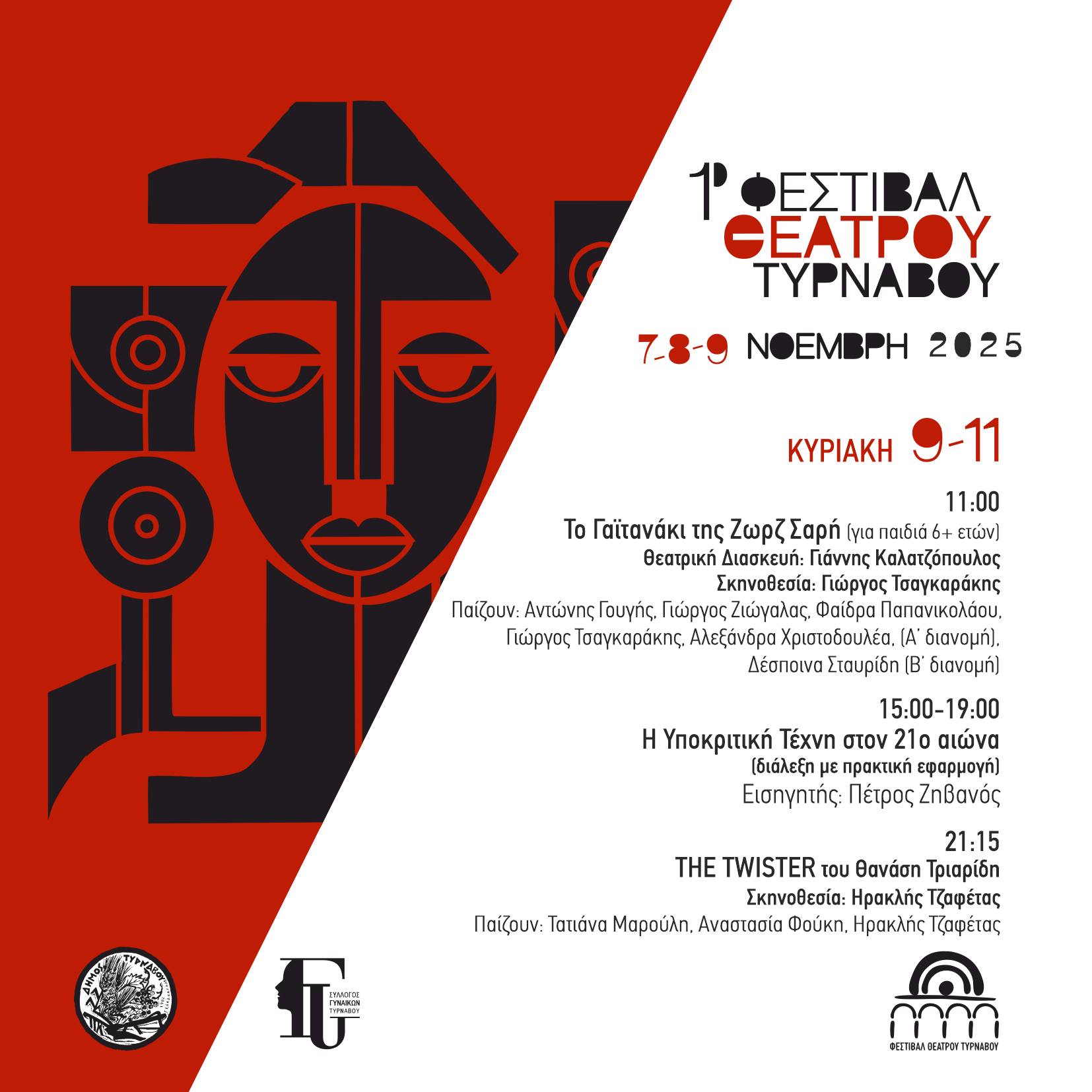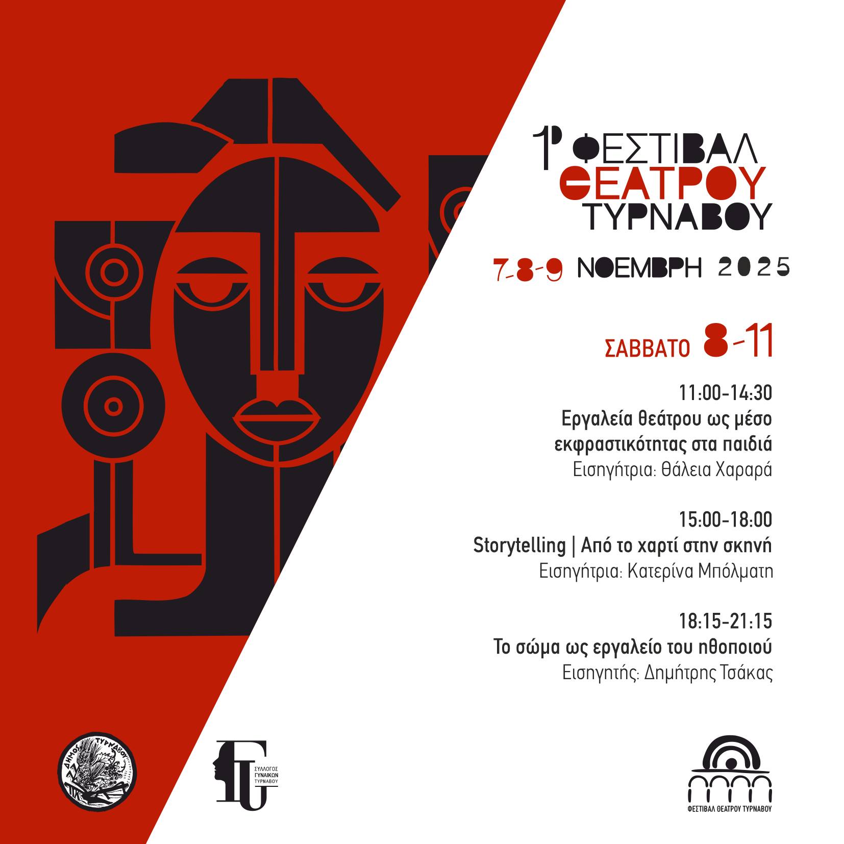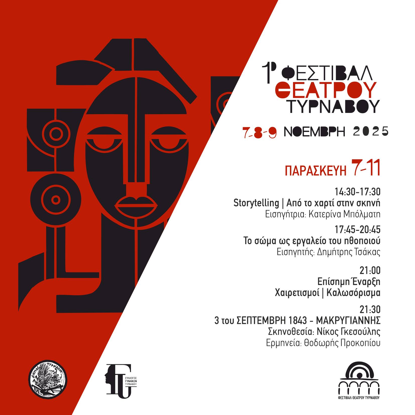 7 November 20251st Theatre Festival in Tyrnavos / November 7–9The Municipality of Tyrnavos is organizing the 1st Theatre Festival in Tyrnavos, taking place on November 7, 8, and 9 at the Municipal Theatre of Tyrnavos, in collaboration with the Women’s Association of Tyrnavos. The festival aspires to become an established institution that promotes theatrical culture and brings audiences closer to theatre as a vibrant and timeless medium of communication and collaboration.1st TYRNAVOS THEATRE FESTIVAL 2025PROGRAMFRIDAY 7/1114:30-17:30Storytelling – From the page to the stageInstructor: Katerina Bolmati17:45-20:45The body as an actor’s toolInstructor: Dimitris Tsakas21:00 Official OpeningGreetings / Welcome21:30“3rd of SEPTEMBER 1843 – MAKRYGIANNIS”Directed by: Nikos GesoulisPerformed by: Thodoris ProkopiouSATURDAY 8/1111:00-14:30Theatre tools as a means of expression for childrenInstructor: Thaleia Charara15:00-18:00Storytelling – From the page to the stageInstructor: Katerina Bolmati18:15-21:15The body as an actor’s toolInstructor: Dimitris TsakasSUNDAY 9/1111:00“The Maypole” by Zorz Sarri (for children aged 6+)Theatrical Adaptation: Giannis KalatzopoulosDirected by: Giorgos TsagkarakisCast: Danai Alisandratou, Giannis Yiaramazidis, Antonis Gougis, SofiaSimou, Giorgos TsagkarakisMusicians on stage: Danai Alisandratou, Antonis Gougis15:00-19:00The Art of Acting in the 21st Century(lecture with practical application)Instructor: Petros Zivanos21:15“THE TWISTER” by Thanasis TriaridisDirected by: Heraklis TzafetasCast: Tatiana Marouli, Anastasia Fouki, Heraklis Tzafetas ΣΧΕΤΙΚΟΙ ΠΡΟΟΡΙΣΜΟΙTYRNAVOS - Tsipouro gladdens the heart…,OLYMPUS - Thessaly’s Calm Power,